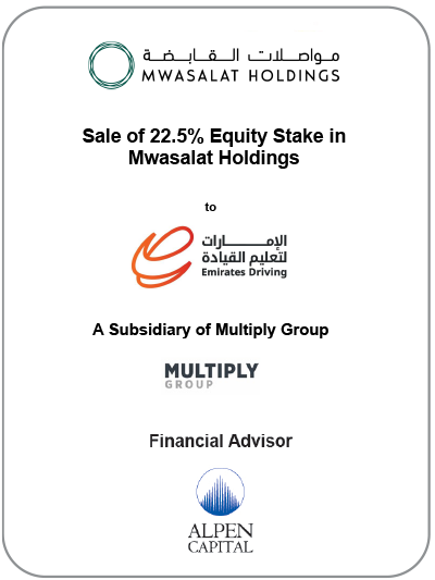 Alpen Capital advised Mwasalat Holdings (“Mwasalat”) on the sale of a 22.5% stake to Emirates Driving Company PJSC (“EDC”), a subsidiary of Multiply Group PJSC (“Multiply Group”). This investment involves an option to increase EDC’s shareholding to 50.6%, subject to completion of certain conditions and relevant regulatory approvals. Click here to view the press release .