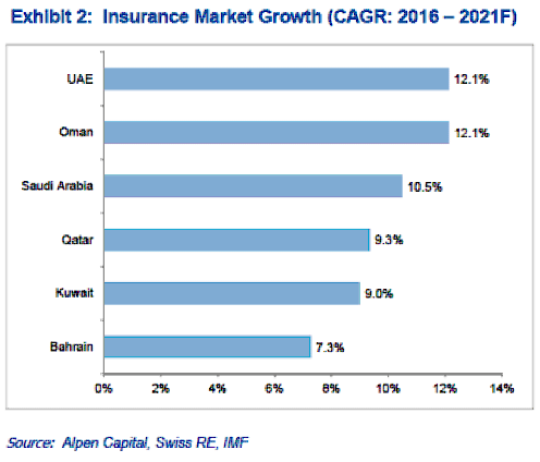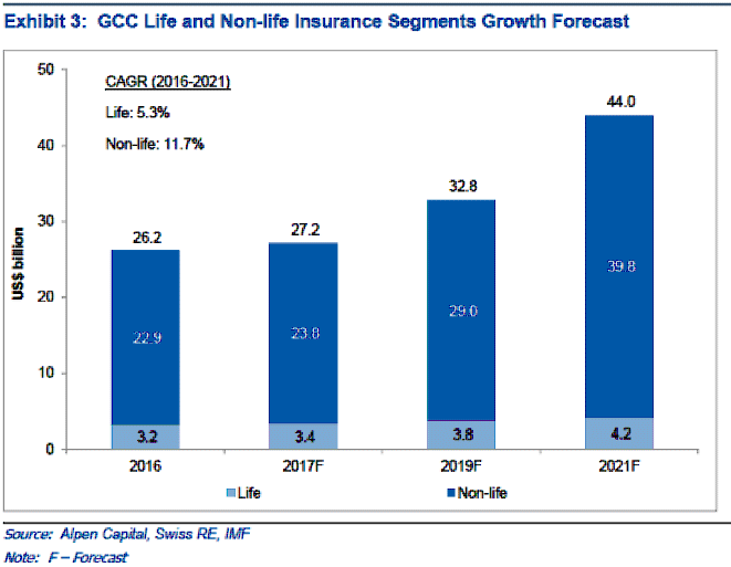 According to Alpen Capital, the GCC insurance market is projected to grow at a CAGR of 10.9% from US$ 26.2 billion in 2016 to US$ 44.0 billion in 2021. This projection is based on existing fundamentals of the industry and economic outlook.
