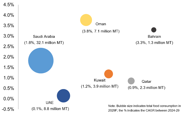 The country-wise food consumption share in the GCC is projected to change marginally through 2029. Saudi Arabia and the UAE are expected to remain the largest food-consuming nations, and their combined share of total GCC food consumption is forecasted to reach 73.8% by 2029. Oman is set to witness the highest CAGR at 3.8%, followed by Bahrain with a CAGR of 3.3% during the forecast period. The remaining GCC countries are expected to register growth rates between 0.1% and 1.8%.