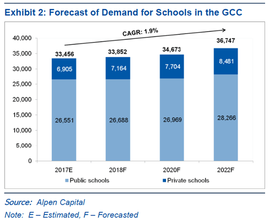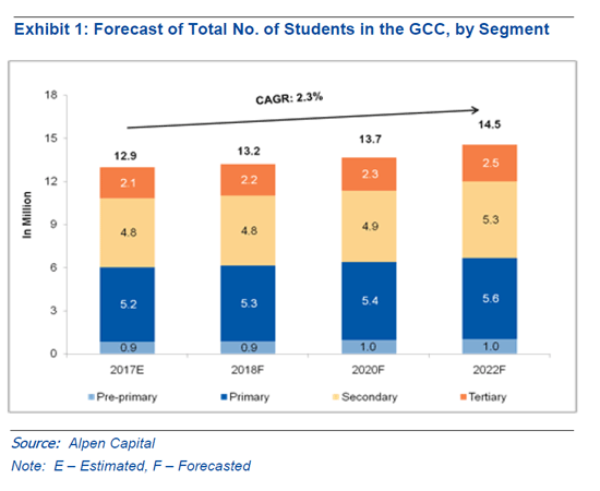 According to Alpen Capital, the total number of students in the GCC education sector is projected to reach 14.5 million in 2022, registering a CAGR of 2.3% from an estimated 12.9 million in 2017. A growing school age population, high per capita income, continued government spending and long term strategic government initiatives is expected to drive the future growth of the GCC education sector.