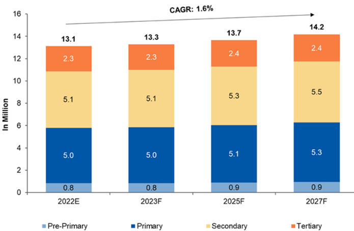 The number of students in private schools is projected to grow at a CAGR of 1.7%, whereas enrolments at public schools is likely to increase at a marginally slower pace, recording a CAGR of 1.5% between 2022 and 2027.