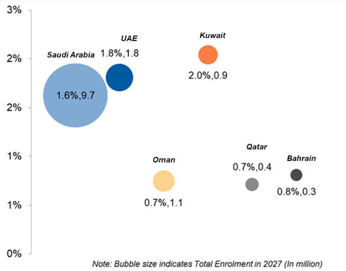 Growth rates among the GCC nations varies widely owing to country-specific population projections, cost of education, government support and maturity of the sector, among other factors. Saudi Arabia is expected to remain the largest education market in the GCC growing at a CAGR of 1.6%. In terms of annualized growth, the number of students in Kuwait and UAE are projected to grow at a faster rate than the other member nations between 2022 and 2027