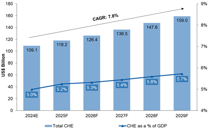 Current Healthcare Expenditure & GDP Share Forecast (2024E–2029F)