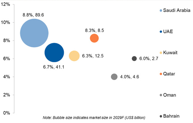 According to Alpen Capital, CHE in the GCC is expected to grow from an estimated US$ 109.1 billion in 2024 to US$ 159 billion in 2029, at a CAGR of 7.8%. The region’s expanding population base, high incidence of NCDs, rising cost of treatment and medical inflation, coupled with increasing penetration of health insurance are expected to drive growth.
