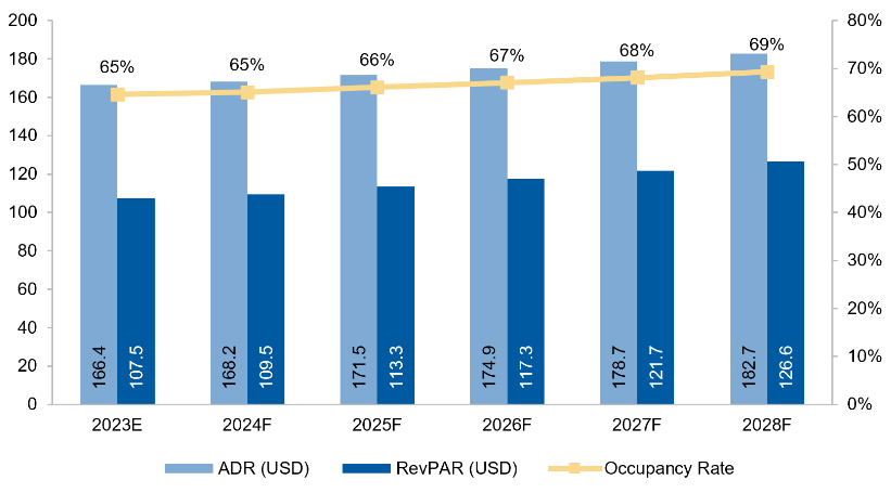 Hotel Occupancy, ADR & RevPAR Trends (2023E–2028F)